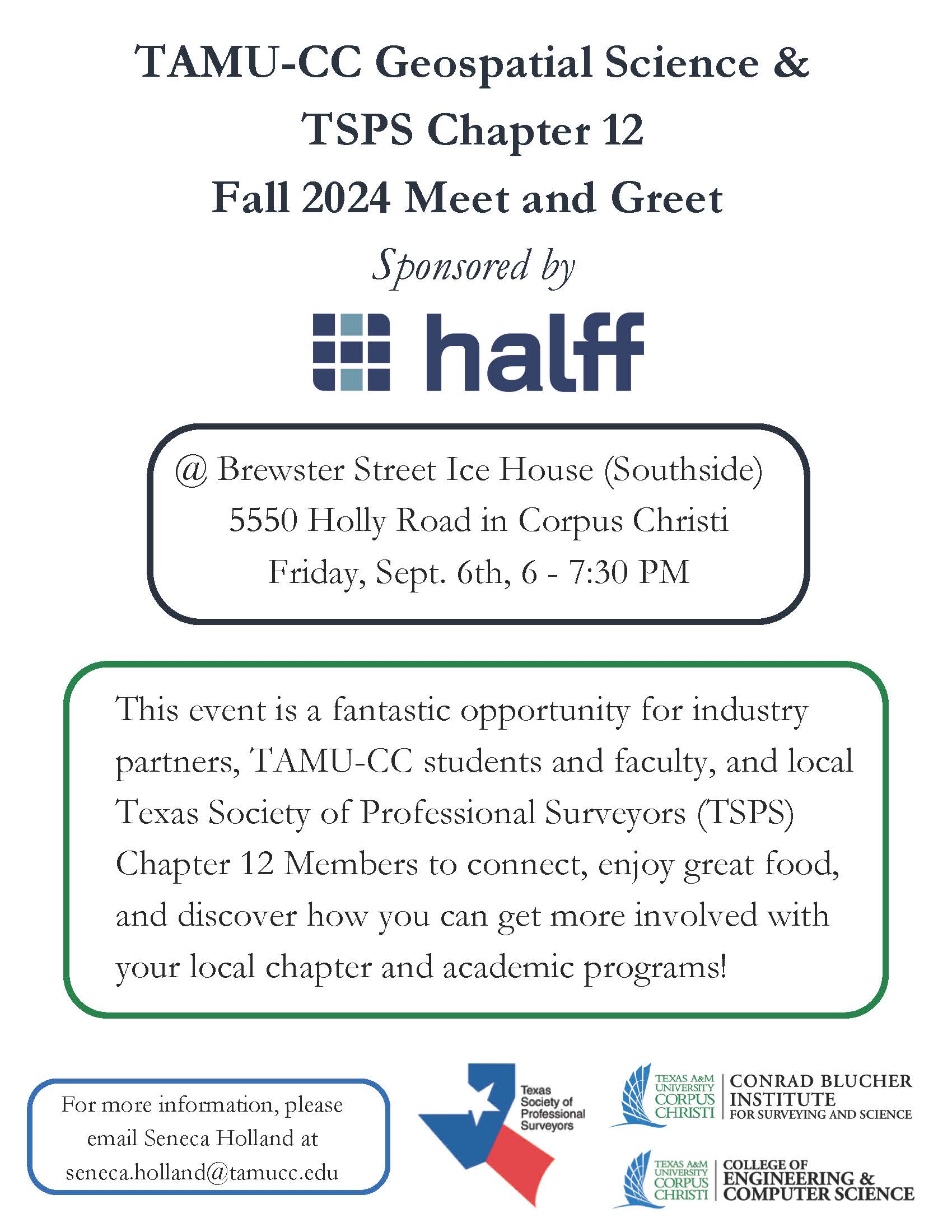 TAMU-CC Geospatial Science & TSPS Chapter 12 Fall 2024 Meet and Greet This event is a fantastic opportunity for industry partners, TAMU-CC students and faculty, and local Texas Society of Professional Surveyors (TSPS)Chapter 12 Members to connect, enjoy great food, and discover how you can get more involved with your local chapter and academic programs! For more information, please email Seneca Holland at seneca.holland@tamucc.edu
